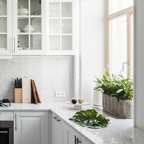За счет светлых оттенков пространство визуально расширится. Дополните кухню деталями из натуральных материалов. Деревянная подставка для ножей, разделочная доска из бамбука придутся по нраву любителям экологичных предметов. Задайте своей кухне творческое настроение с помощью аксессуаров: текстиля, растений или декора.